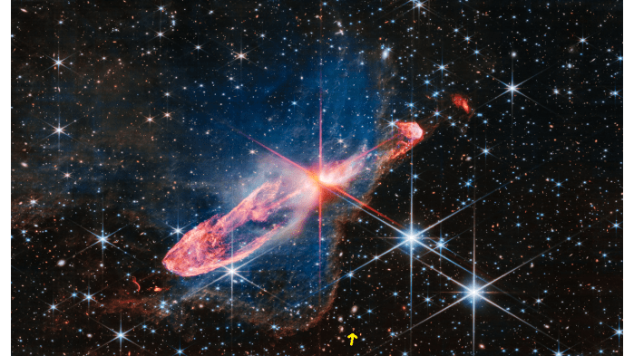 Το διαστημικό τηλεσκόπιο James Webb στις 26 Ιουλίου φωτογράφησε ένα ζεύγος νεαρών άστρων στο πρώτο στάδιο του σχηματισμού τους, που περιφέρονται το ένα γύρω από το άλλο και είναι γνωστά ως Herbig-Haro 46/47. Βρίσκονται στον αστερισμό των Ιστίων (Vela) και απέχουν 1.470 έτη φωτός από τη Γη. Αναζητήστε τα στην παρακάτω εικόνα, στο κέντρο των κόκκινων ακίδων περίθλασης, όπου εμφανίζονται ως μια πορτοκαλο-λευκή κηλίδα. Περιβάλλονται από έναν δίσκο αερίου και σκόνης που συνεχίζει να προστίθεται στη μάζα τους, ενώ οι πορτοκαλί λοβοί προς αντίθετες κατευθύνσεις δημιουργήθηκαν από προηγούμενες εκτινάξεις ύλης από τα δυο άστρα. Όμως εδώ δεν μας ενδιαφέρει το σύστημα Herbig-Haro 46/47 (για το οποίο μπορείτε να διαβάσετε αλλού), αλλά μια λεπτομέρεια που βρίσκει το παρατηρητικό μάτι στο υπόβαθρο της πρόσφατης εικόνας του James Webb: