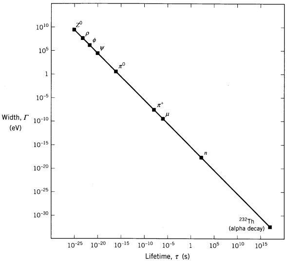 Ένας αναπάντεχος τρόπος για να υπολογίσουμε τον χρόνο ζωής των ασταθών σωματιδίων είναι διαμέσου της κβαντομηχανικής σχέσης: . Η σχέση αυτή αποκαλείται συχνά «σχέση αβεβαιότητας ενέργειας-χρόνου», ένα παραπλανητικό όνομα, διότι ανακαλεί αδόκιμα την θεμελιώδη κβαντομηχανική σχέση αβεβαιότητας θέσης-ορμής