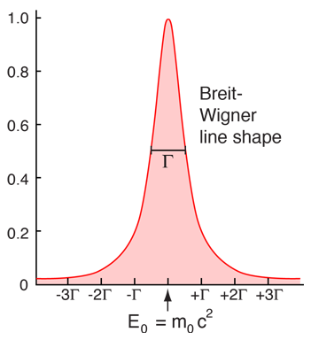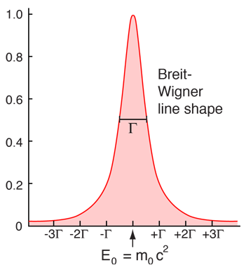 Κι όταν ανασυνθέσουμε την τιμή της μάζας (ενέργειας) του αρχικού ασταθούς σωματιδίου, θα βρούμε μια κωδωνοειδή κατανομή πιθανοτήτων, που ονομάζεται καμπύλη συντονισμού ή κατανομή Lorentzian ή Breit-Wigner: