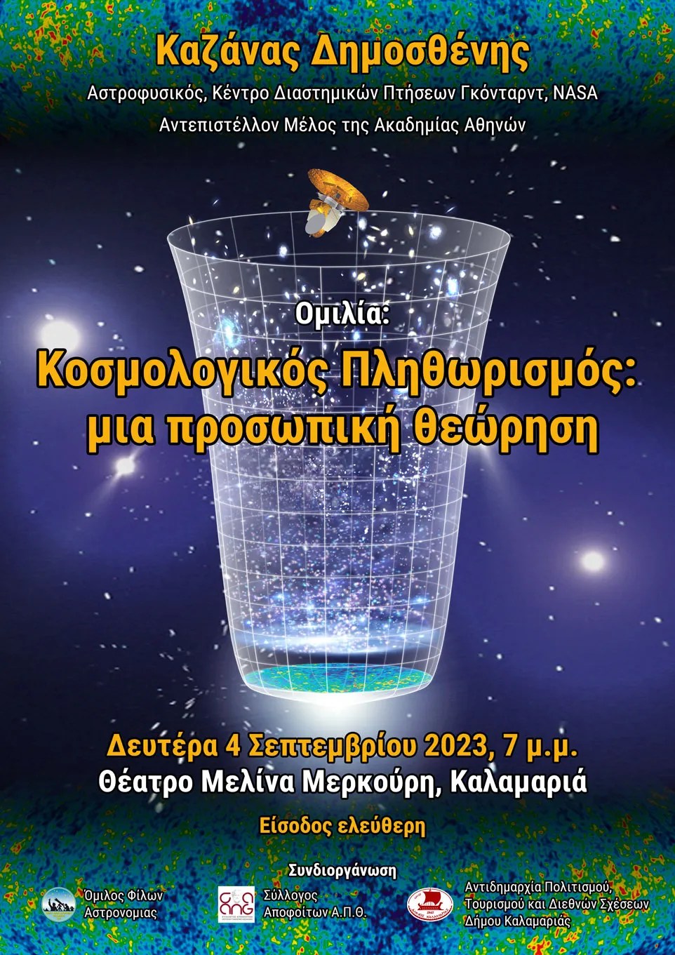 Κοσμολογικός Πληθωρισμός: μια προσωπική θεώρηση, με εισηγητή τον Δημοσθένη Καζάνα, Αστροφυσικό στο Κέντρο Διαστημικών Πτήσεων Γκόνταρντ της NASA και αντεπιστέλλον Μέλος της Ακαδημίας Αθηνών.