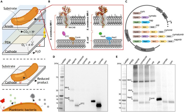 Για να ενισχύσουν την ικανότητα του E. coli να παράγει ηλεκτρισμό, οι ερευνητές τροποποίησαν το γονιδίωμά του ώστε να περιλαμβάνει οδηγίες για πρωτεϊνικά σύμπλοκα που βρίσκονται στο βακτήριο Shewanella oneidensis, γνωστό για την παραγωγή ηλεκτρικής ενέργειας. Το S. oneidensis παράγει μια ροή ηλεκτρονίων όταν ανάγει μέταλλα, ένα ηλεκτρικό σήμα που έχει χρησιμοποιηθεί, για παράδειγμα, για την ανίχνευση τοξικών μετάλλων όπως το αρσενικό, σε πρωτότυπα συστήματα.