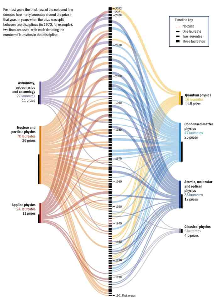 Από την πλευρά του το γνωστό περιοδικό PhysicsWorld για να μαντέψει τα φετινά Νόμπελ Φυσικής δημιούργησε το παρακάτω διάγραμμα που αντιστοιχεί τα μέχρι πέρυσι βραβεία Νόμπελ με τους διαφόρους τομείς της Φυσικής: