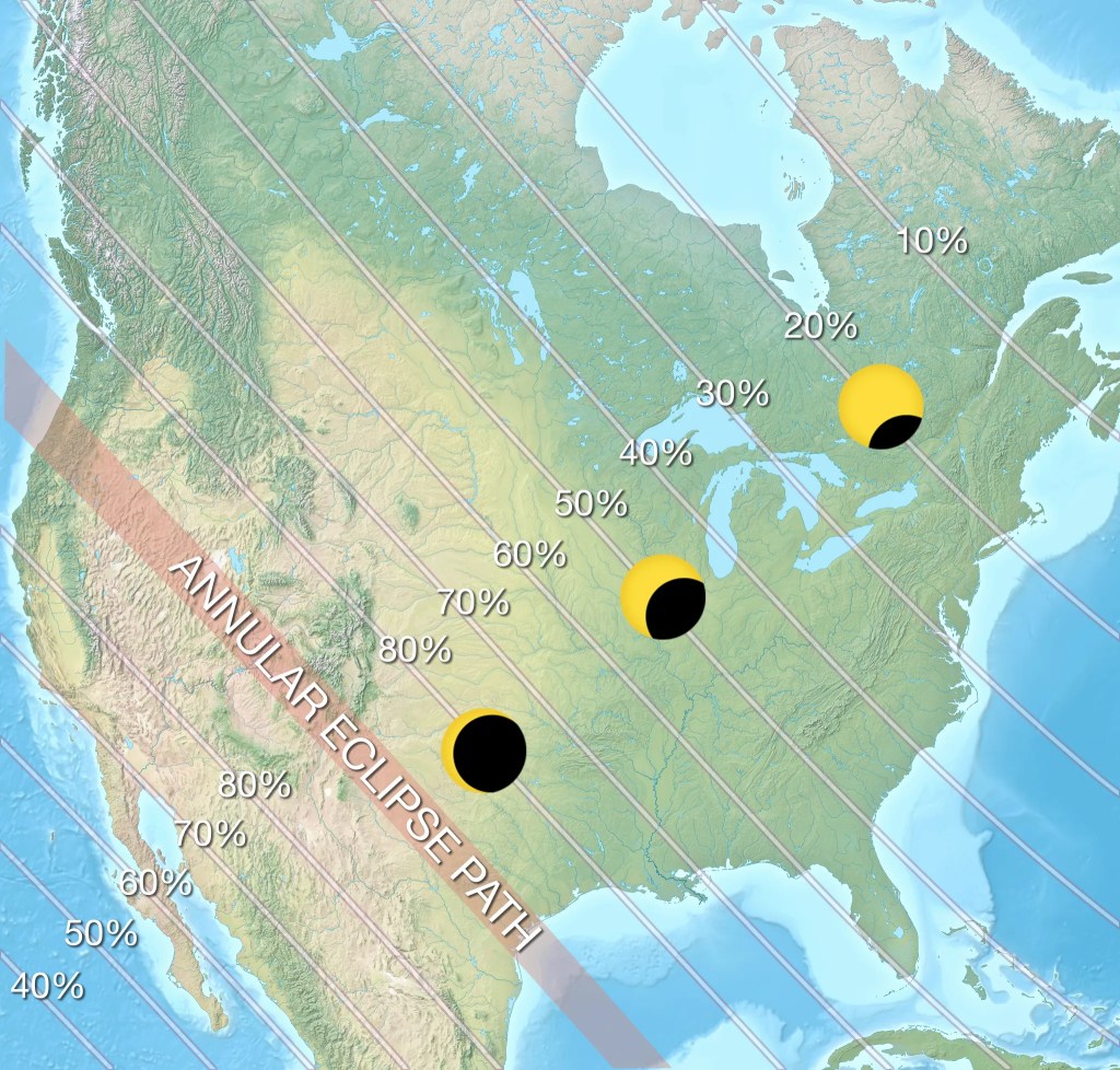 | 14 | Δακτυλιοειδής Έκλειψη Ηλίου (δυτικές ΗΠΑ, κεντρική Αμερική, Κολομβία, Βραζιλία, μέγιστη διάρκεια 5 λεπτά και 17 δεύτερα) |