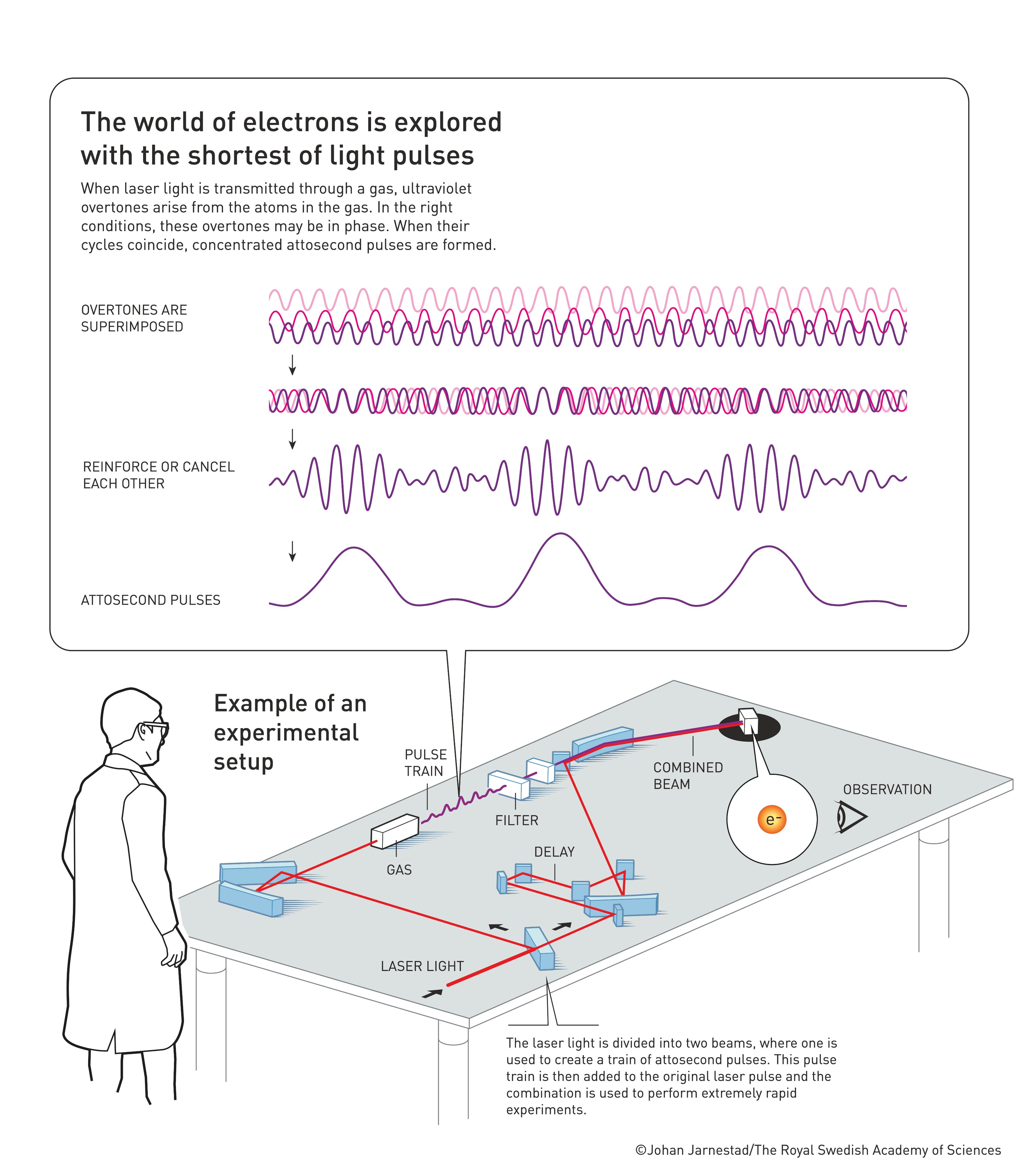 Τα πειράματα των βραβευθέντων φυσικών παρήγαγαν παλμούς φωτός τόσο σύντομους που μετρώνται σε ατοδευτερόλεπτα, αποδεικνύοντας έτσι ότι αυτοί οι παλμοί μπορούν να χρησιμοποιηθούν για να πάρουμε εικόνες διεργασιών μέσα στα άτομα και τα μόρια.