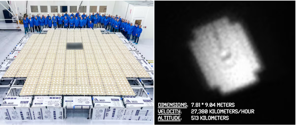 O δορυφόρος BlueWalker 3 πριν την εκτόξευσή του (αριστερά), και η φωτογραφία του στο διάστημα μετά την εκτόξευσή του (δεξιά)