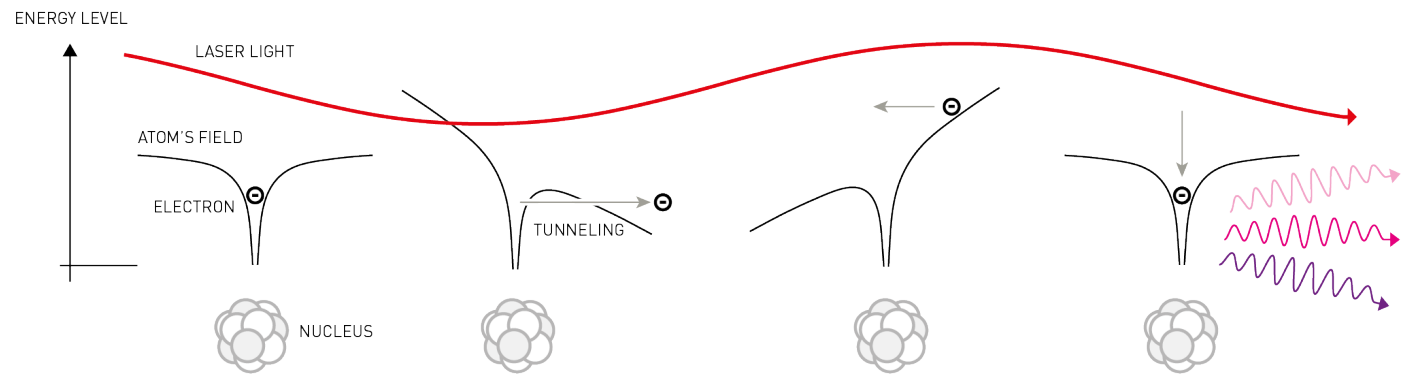 Πολλές υψηλής τάξης αρμονικές παρήχθησαν όταν ευγενή αέρια ακτινοβολήθηκαν με υπέρυθρα φωτόνια έντασης 1013 W/cm2, που αντιστοιχούσαν σε σύμφωνες εκπομπές ακτινοβολίας με συχνότητες που ήταν πολλαπλάσια της συχνότητας του λέιζερ. Ήταν εκπληκτικό το γεγονός ότι η ένταση εκπομπής των περιττών αρμονικών αρχικά μειώθηκε μάλλον απότομα, στη συνέχεια ήταν ουσιαστικά σταθερή από την 5η αρμονική μέχρι περίπου την 33η αρμονική για το αργό, και μετά μειωνόταν ξανά.