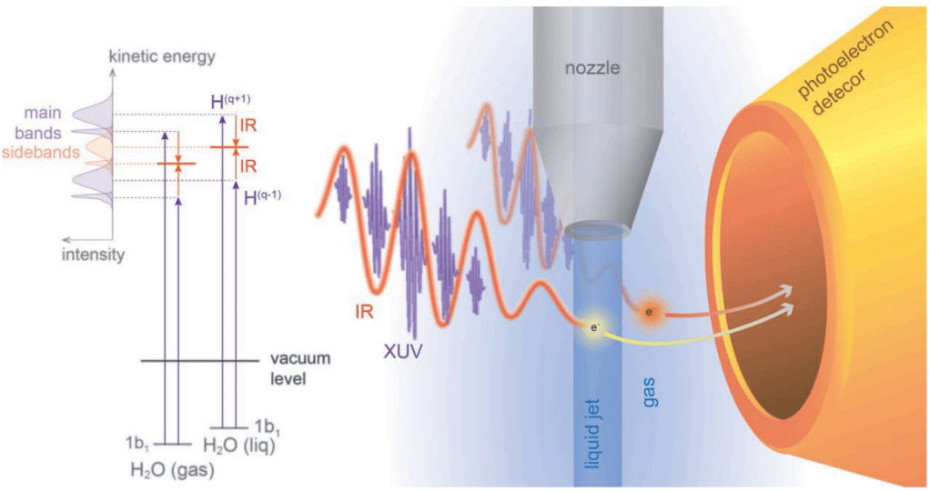Σε χρονικές κλίμακες attoseconds, όλοι οι τύποι δομικής δυναμικής παγώνουν, εκτός από εκείνη των ηλεκτρονίων, και έτσι το πείραμα επιτρέπει την μελέτη της δυναμικής των ηλεκτρονίων. Όπως δείχνει το σχήμα 5, μια σειρά παλμών attoseconds υπερτιθέμενη με έναν σχεδόν IR παλμό femtosecond λέιζερ αλληλεπίδρασε με νερό σε υγρή φάση και αέρια φάση. Τα φωτοηλεκτρόνια εκπέμπονταν ταυτόχρονα από τα μόρια του νερού στην υγρή και αέρια φάση και το πείραμα έδειξε μια χρονική καθυστέρηση 50 έως 70 attoseconds μεταξύ των φωτοηλεκτρονίων από υγρό νερό και εκείνων από αέριο νερό. Αυτό το πείραμα έδειξε ποσοτικά ότι τα ηλεκτρόνια από το υγρό νερό φτάνουν στον ανιχνευτή φωτοηλεκτρονίων αργότερα από τα ηλεκτρόνια από το αέριο νερό.