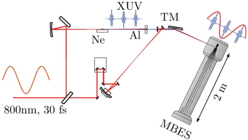Σχήμα 3. Σχηματική απεικόνιση του πειράματος στο Lund. Χρησιμοποιεί την τεχνική της “reconstruction of attosecond beating by interference of two-photon transitions (RABBIT)«. Το λέιζερ-οδηγός στα 800 nm, 30 femtosecond (fs), κατευθύνεται προς δύο διαφορετικούς βραχίονες διαμέσου ενός διαχωριστή δέσμης. Η παραγωγή υψηλών αρμονικών (HHG) σε ένα πίδακα αερίου νέον δίνει μια σειρά παλμών XUV attosecond. Οι παλμοί υπερύθρων (ΙR) από το λέιζερ-οδηγό και οι παλμοί XUV (συνήθως με εύρος ζώνης 10–20 eV) επικαλύπτονται και εστιάζονται από ένα τοροειδές κάτοπτρο στον στόχο του αερίου νέον. Τα φωτόνια XUV ιονίζουν το αέριο-στόχο και τα φωτοηλεκτρόνια αναλύονται με φασματόμετρο μαγνητικής φιάλης. Οι επικαλυπτόμενοι παλμοί IR/XUV δημιουργούν σήματα πλευρικής ζώνης που μπορούν να διαχωρίσουν τα ηλεκτρόνια (shake-up) που διεγείρονται σε υψηλότερο επίπεδο ενέργειας (μετα ηλεκτρόνια 2p να ιονίζονται ή να μεταβαίνουν από το τροχιακό 2p στο 3p) από τα ηλεκτρόνια 2s, παρά το γεγονός ότι η διαφορά ενέργειας είναι μόνο 7,4 eV.