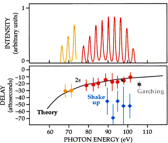 Η πολύ καλή συμφωνία μεταξύ του πειράματος του Lund και των θεωρητικών υπολογισμών από τη θεωρία πολλών διαταραχών υποδηλώνει ότι το πρωτοποριακό αποτέλεσμα από την ομάδα Krausz επηρεάστηκε από τα ηλεκτρόνια που διεγείρονται σε υψηλότερο επίπεδο ενέργειας (shake-up). Η διαφορά ενέργειας μεταξύ ενός μόνο φωτονίου που αφαιρεί ένα ηλεκτρόνιο από το τροχιακό 2p, ενώ ταυτόχρονα προωθεί ένα άλλο ηλεκτρόνιο από το 2p στο 3p είναι μόνο 7,4 eV περισσότερη ενέργεια από τον άμεσο ιονισμό ενός ηλεκτρονίου 2s. Στο πείραμα Lund, τα σήματα της πλευρικής ζώνης από ηλεκτρόνια shake-up και τον ιονισμό 2s μπορούσαν να διαχωριστούν. Αυτό θα είχε μείνει άλυτο στο πείραμα του Garching.