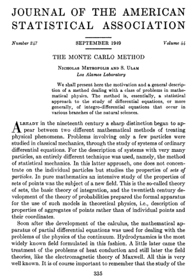 Το μεγαλύτερο προσωπικό επίτευγμα του Metropolis υπήρξε ίσως η ανάπτυξη της μεθόδου υπολογισμών Monte Carlo. Η μέθοδος συνίσταται σε μια μεθοδολογία-αλγόριθμο για την τυχαία δειγματοληψία των τιμών της εξέλιξης ενός φαινομένου, όταν η περιγραφή και ο υπολογισμός των παραμέτρων του ή η μαθηματική του περιγραφή δεν είναι επαρκείς ή όταν η εξίσωση που το περιγράφει είναι δυσεπίλυτη. Το όνομα Monte Carlo ήταν επίσης εύρημα του Metropolis, ο οποίος συσχέτισε τη χρήση τυχαίων αριθμών για τη δειγματοληψία ενός φαινομένου με το καζίνο της ομώνυμης πόλης. Η μέθοδος Monte Carlo κατατάχτηκε από το περιοδικό Computing Εngineering μεταξύ των δέκα κορυφαίων αλγορίθμων με τη «μεγαλύτερη επιρροή στην ανάπτυξη και την πρακτική της επιστήμης και της μηχανικής στον 20ό αιώνα».