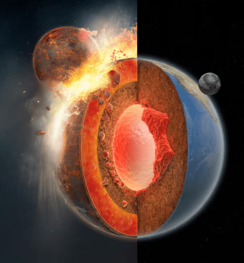 Από την σύγκρουση της αρχέγονης Γης με το αστρονομικό αντικείμενο Θεία πριν από 4,5 δισεκατομμύρια χρόνια, προέκυψε το σημερινό δίδυμο Γης-Σελήνης