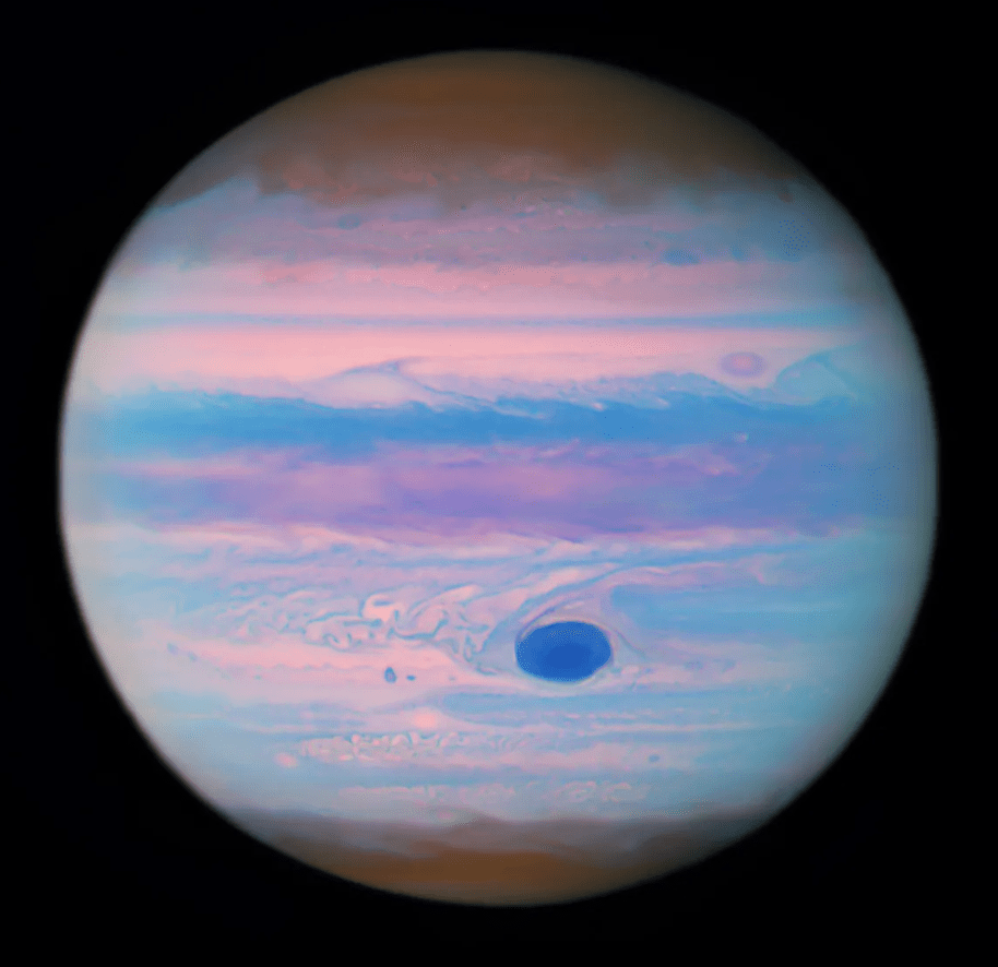 Το διαστημικό τηλεσκόπιο Hubble δημοσίευσε μια εντυπωσιακή εικόνα του Δία στο υπεριώδες φως, που περιλαμβάνει την εμβληματική, γιγάντια καταιγίδα που ονομάζεται «Μεγάλη Ερυθρά Κηλίδα», η οποία φαίνεται κόκκινη στο ορατό φως. Τα δεδομένα που χρησιμοποιήθηκαν για τη δημιουργία αυτής της υπεριώδους εικόνας είναι μέρος μιας έρευνας των αστρονόμων του διαστημικού τηλεσκοπίου Hubble που εξέταζαν την κρυμμένη δομή της υπερθύελλας του Δία.