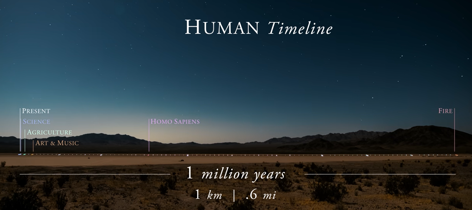 Το δεύτερο έργο τους, με τον τίτλο «To Scale: Time» που ανέβηκε στο YouTube πριν από λίγες εβδομάδες και είναι και το πιο τολμηρό, χρειάστηκε τέσσερα χρόνια για να στηθεί. Πρόκειται για ένα εντυπωσιακό ταξίδι στον χρόνο, όπου τοποθετώντας φωτάκια κάθε 10 μέτρα σε μια ευθεία γραμμή που εκτείνεται σε 7 χιλιόμετρα, απεικονίζεται η ιστορία του Σύμπαντος. Από τη Μεγάλη Εκρηξη, 13,8 δισ. χρόνια πριν, μέχρι την εμφάνιση του πρώτου homo sapiens 300.000 πριν. Κάθε 10 μέτρα ένα καινούργιο συμβάν το οποίο οπτικοποιείται (πριν από τόσα χρόνια τα ερπετά, οι δεινόσαυροι τότε, ο Νεάντερταλ, η Αναγέννηση και ούτω καθεξής). Το τελευταίο της κομμάτι, η ιστορία του homo sapiens, εκτείνεται σε μόλις μερικά εκατοστά, που αντιστοιχούν σε 300.000 χρόνια. Η ζωή σου, ή η δική μου, δεν θα ήταν παραπάνω από μια κλωστή.
