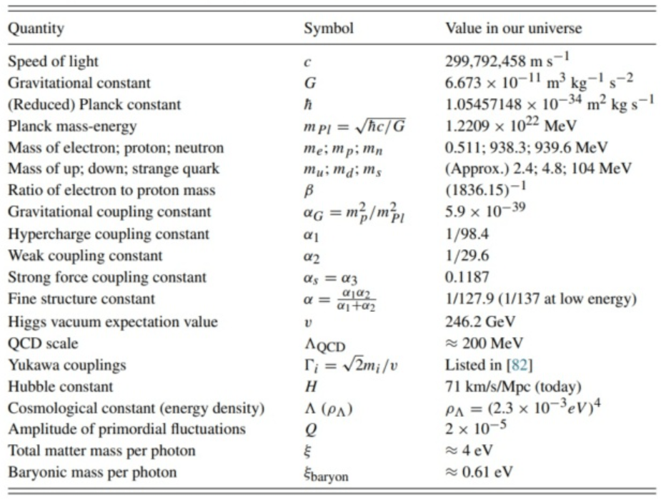 Αυτή η προσπάθεια ήταν απίστευτα επιτυχημένη και μας παρέχει μια μεγάλη εικόνα του φυσικού σύμπαντος. Αλλά πουθενά στο εννοιολογικό πλαίσιο της Φυσικής δεν προτείνεται η αναγκαιότητα να εξηγήσουμε τις τιμές των σταθερών της φύσης με κάποιο είδος προβλεπτικού μοντέλου. Στην πραγματικότητα, αν το σκεφτούμε λίγο, αντιλαμβανόμαστε ότι ένα τέτοιο εγχείρημα είναι θεμελιωδώς αδύνατο. Οποιοδήποτε μοντέλο του φυσικού σύμπαντος πρέπει να ξεκινά με κάποια τιμή μιας παραμέτρου που καθορίζει την ενεργειακή κλίμακα στην οποία λειτουργεί αυτό το μοντέλο.