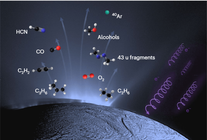 Στην εργασία τους με τίτλο «Detection of HCN and diverse redox chemistry in the plume of Enceladus«, οι ερευνητές Peter et al, υποστηρίζουν ότι η ανάλυση των δεδομένων που συνέλλεξε το διαστημικό σκάφος Cassini από πίδακες που εκτοξεύονται στο νότιο πόλο του Εγκέλδαδου, δείχνει την ύπαρξη μορίων υδροκυανίου (HCN), αλλά και αιθινίου C2H2, προπενίου (C3H6)και αιθανίου (C2H6). Υπενθυμίζεται ότι παλαιότερες μελέτες έδειξαν την ύπαρξη νερού (H2O), διοξειδίου του άνθρακα(CO2), μεθανίου (CH4), αμμωνίας (NH3) και υδρογόνου (H2). Σύμφωνα με τους ερευνητές κάτω από ορισμένες προϋποθέσεις οι ενώσεις θα μπορούσαν ενδεχομένως να υποστηρίξουν μικροβιακές κοινότητες ή να οδηγήσουν σε κάποιου είδους πολύπλοκη οργανική σύνθεση που οδηγεί στην προέλευση της ζωής.