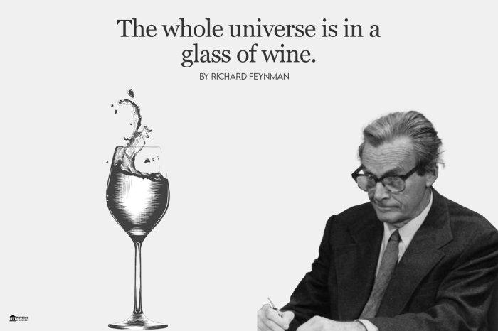 Είναι όμως αλήθεια πως αν κοιτάξουμε ένα ποτήρι κρασί από πολύ κοντά θα δούμε ολόκληρο το σύμπαν μέσα σ’ αυτό. Θα δούμε φυσικά φαινόμενα: το περιδινούμενο υγρό που εξατμίζεται ανάλογα με τις συνθήκες της ατμόσφαιρας, τις αντανακλάσεις στο γυαλί και η φαντασία μας μπορεί να προσθέσει και την ύπαρξη των ατόμων.