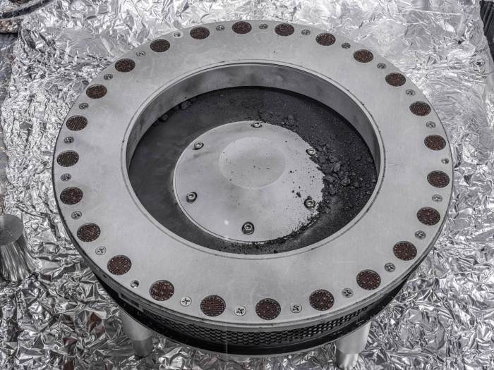 Εικόνα του εξωτερικού του συλλέκτη δειγμάτων του OSIRIS-REx. Δείγμα υλικού από τον αστεροειδή Bennu φαίνεται δεξιά. Οι επιστήμονες βρήκαν στοιχεία τόσο άνθρακα όσο και νερού στην αρχική ανάλυση αυτού του υλικού. Το μεγαλύτερο μέρος του δείγματος βρίσκεται στο εσωτερικό.