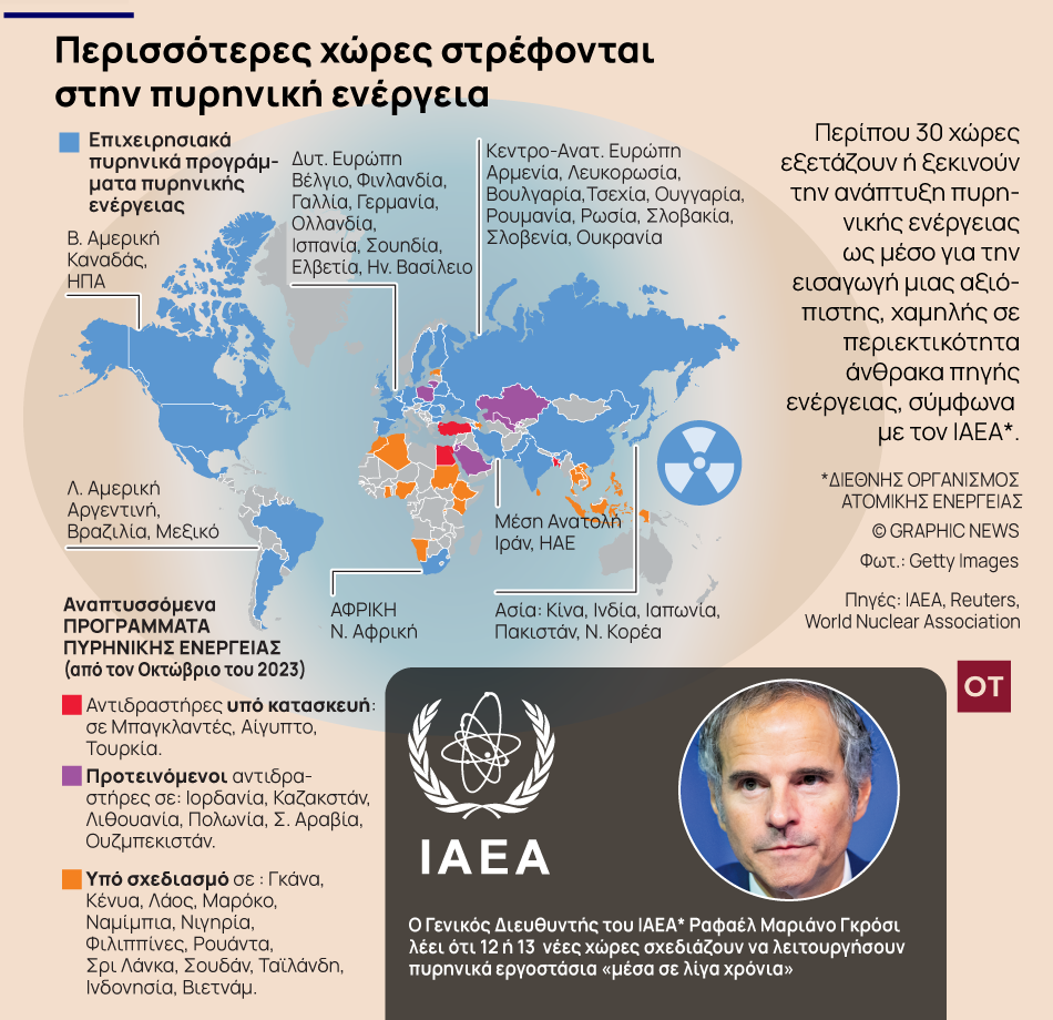Η «αποδαιμονοποίηση του αντιδραστήρα» εξελίσσεται σε χώρες γνωστές για τις περιβαλλοντικές τους ευαισθησίες. Στη Φινλανδία τον περασμένο Απρίλιο τέθηκε σε λειτουργία έπειτα από παρελκύσεις… 13 ετών ένας αντιδραστήρας που κατασκευάστηκε σε συνεργασία με τη Γαλλία. Ο κλάδος καλύπτει μόνο το 4% της παραγόμενης ενέργειας στον κόσμο. Αλλά όπως φάνηκε και στην COP 28 το Δεκέμβριο στο Ντουμπάι, θα αναπτυχθεί παράλληλα με τον κλάδο των ανανεώσιμων πηγών.