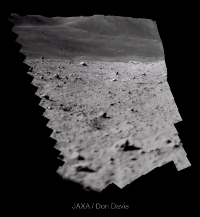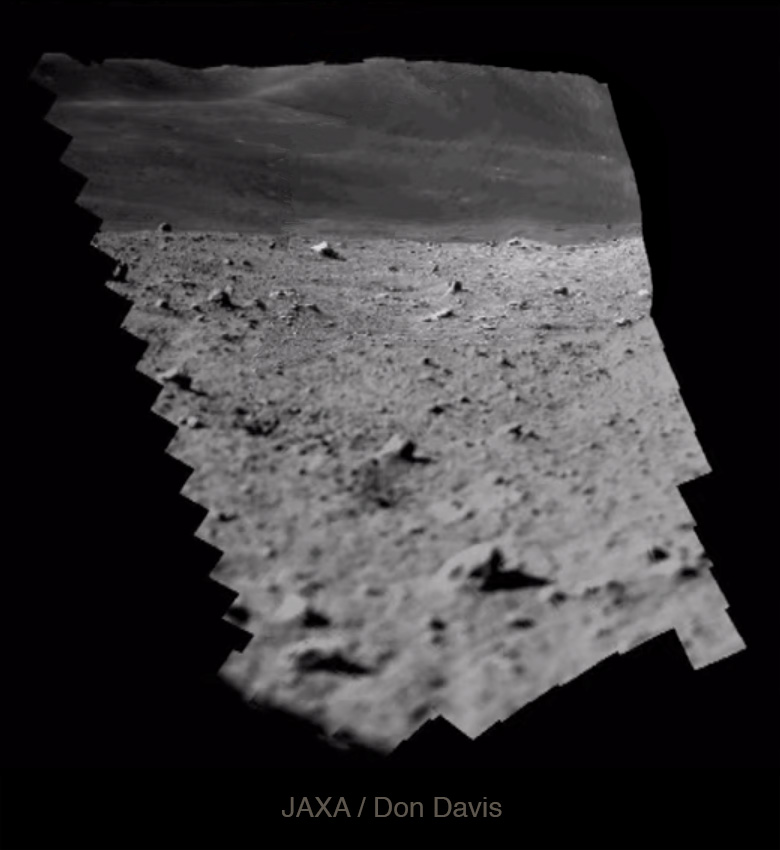 Ευτυχώς το SLIM ρόλαβε να αποβιβάσει δύο μικρά ρομπότ, τα οποία σχεδιάστηκαν για αναλύσεις του σεληνιακού μανδύα, για τον οποίο μέχρι σήμερα υπάρχουν σχετικά λίγα δεδομένα. Έτσι προέκυψε η παραπάνω φωτογραφία του προσεληνωμένου SLIM και το παρακάτω τοπίο από την επιφάνεια της Σελήνης: