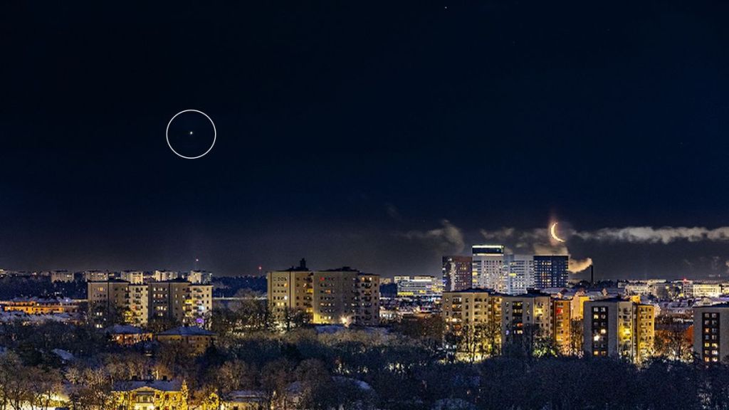 Η Αφροδίτη (σε κύκλο) στον νυχτερινό ουρανό της Στοκχόλμης όταν προκλήθηκε η πράσινη αναλαμπή της
