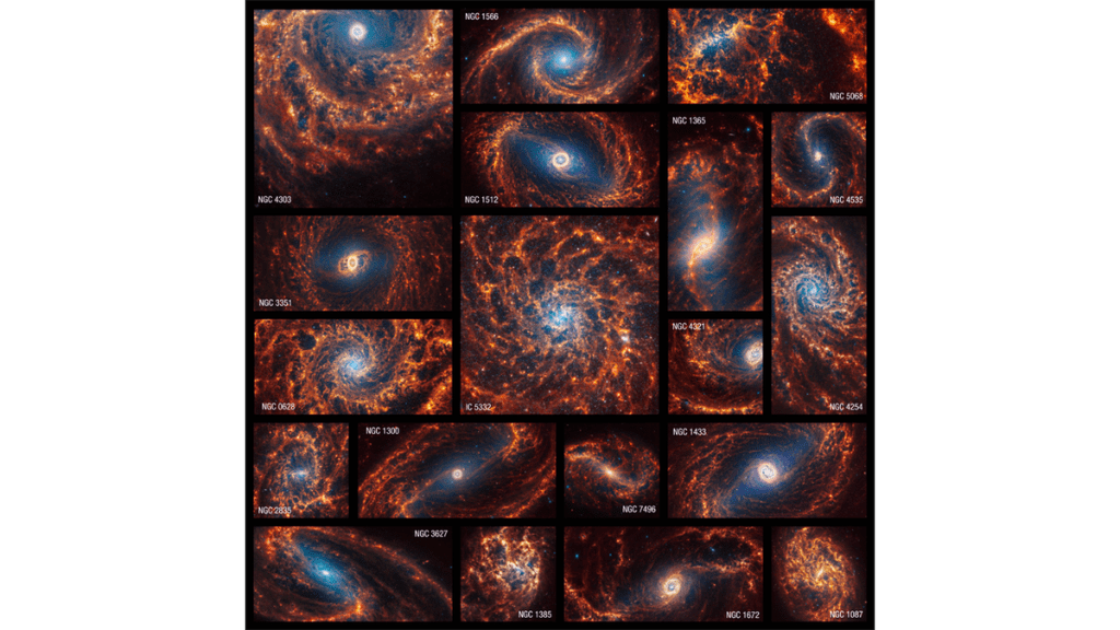 Το διαστημικό τηλεσκόπιο James Webb κατέγραψε μια σειρά από εντυπωσιακές εικόνες οι οποίες απεικονίζουν με αξιοσημείωτη λεπτομέρεια 19 σπειροειδείς γαλαξίες, προσφέροντας νέα στοιχεία για τον σχηματισμό αστέρων καθώς και για τη γαλαξιακή δομή και εξέλιξη. Οι σπειροειδείς γαλαξίες, οι οποίοι μοιάζουν με τεράστιους τροχούς, είναι ένας κοινός τύπος γαλαξιών. Ο Γαλαξίας μας είναι ένας από αυτούς.