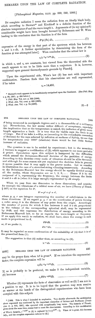 (**) Η δημοσίευση του Rayleigh για την ακτινοβολία του μέλανος σώματος, πριν την δημοσίευση του αντίστοιχου νόμου του Palnck: