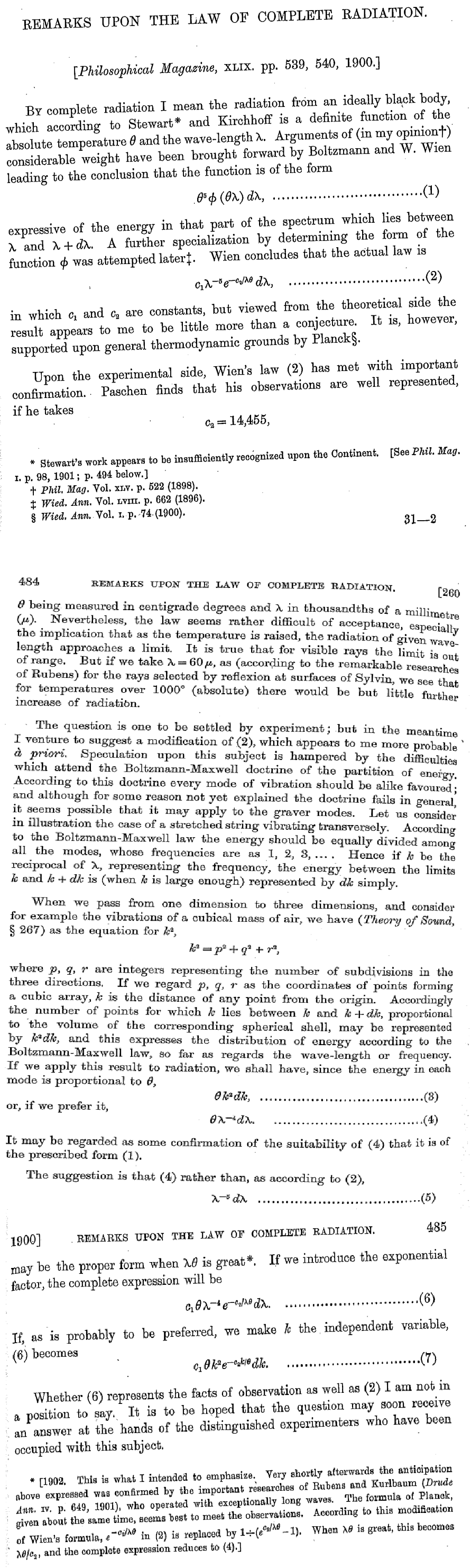 (**) Η δημοσίευση του Rayleigh για την ακτινοβολία του μέλανος σώματος, πριν την δημοσίευση του αντίστοιχου νόμου του Palnck: