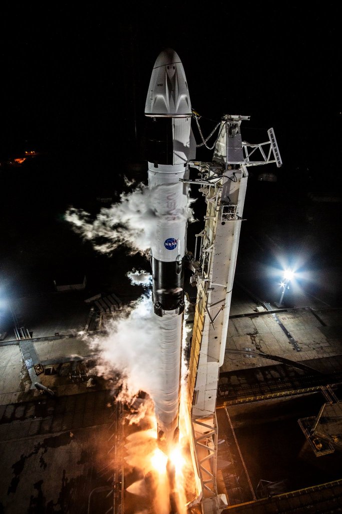 Ο πύραυλος Falcon της SpaceX απογειώθηκε από το Διαστημικό Κέντρο Κένεντι, μεταφέροντας τους Μάθιου Ντόμινικ, Μάικλ Μπάρατ και Τζανέτ Επς της NASA και τον Αλεξάντερ Γκρεμπένκιν της Ρωσίας.