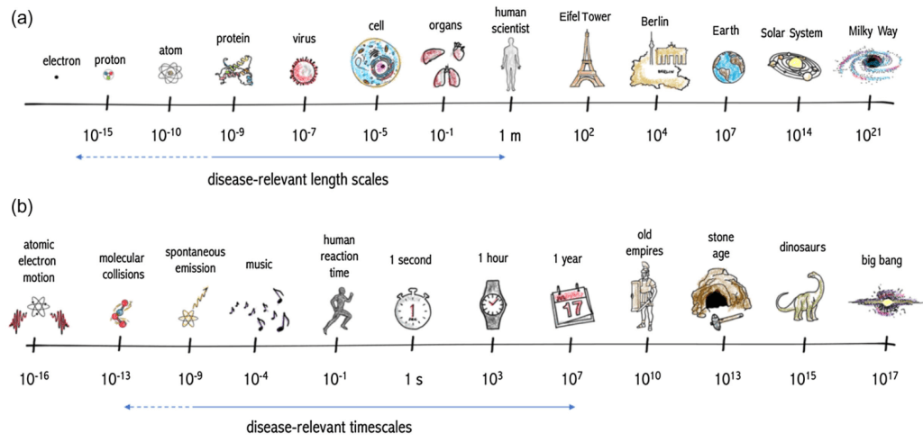 Στο άρθρο του Vahid Sandoghdar με τίτλο ‘Exploring the Physics of Basic Medical Research‘, περιγράφονται ορισμένα βασικά φαινόμενα στο ανθρώπινο σώμα που βασίζονται σε φυσικές αρχές και διέπουν την υγεία μας στο τεράστιο εύρος κλιμάκων μήκους και χρόνου του παραπάνω σχήματος. Υποστηρίζεται ότι η έρευνα στις βιοεπιστήμες μπορεί να ωφεληθεί πολύ από τη μεθοδολογία, την τεχνογνωσία και τη νοοτροπία της κοινότητας της φυσικής και ότι η επιδίωξη της βασικής έρευνας στην ιατρική είναι συμβατή με την αποστολή της φυσικής.