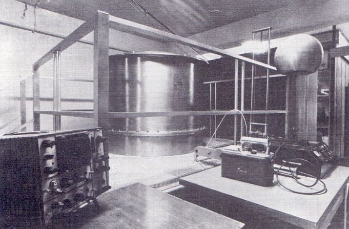Η επόμενη φωτογραφία είναι από το βιβλίο “Τα πενήντα χρόνια του Πανεπιστημίου Θεσσαλονίκης (1926-1976)” του Βασ. Κυριαζόπουλου, Θεσσαλονίκη, 1976, σελ. 125] και μας δείχνει μια άλλη άποψη του αντιδραστήρα (πηγή: https://archive.saloni.ca/1941)
