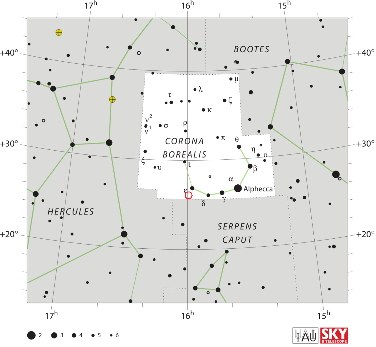 Η θέση του T Coronae Borealis βρίσκεται μέσα στον κύκλο με κόκκινο χρώμα.