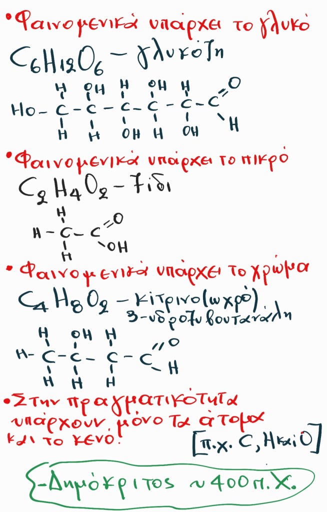 Βρέθηκε τελικά το εξής παράδειγμα από την Οργανική Χημεία: τα άτομα C (άνθρακας), Η (υδρογόνο) και Ο (οξυγόνο) ενώνονται με διαφορετικούς τρόπους και αναλογίες, προκαλώντας σε κάθε περίπτωση το «γλυκό», το «πικρό» και το «χρώμα» που αναφέρει η ρήση του Δημόκριτου: