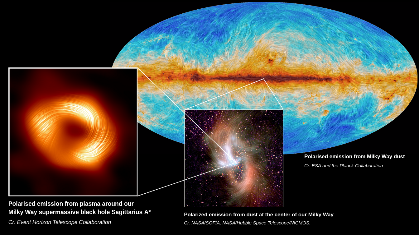 Τώρα, το ΕΗΤ κατέγραψε για πρώτη φορά τα μαγνητικά πεδία που περιβάλλουν τον Τοξότη Α*. Οι εικόνες αποκαλύπτουν ένα πλέγμα «τακτοποιημένων μαγνητικών πεδίων» στη μαύρη τρύπα στο κέντρο του γαλαξία μας τα οποία έχουν ομοιότητες με εκείνα που περιβάλλουν την υπερμεγέθη μαύρη τρύπα στην καρδιά του γαλαξία M87*. Αυτό είναι εκπληκτικό δεδομένου ότι η μαύρη τρύπα στον Μ87 είναι κολοσσιαία με 6,5 δισεκατομμύρια φορές μεγαλύτερη από αυτή του Ήλιου.
