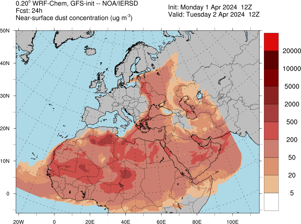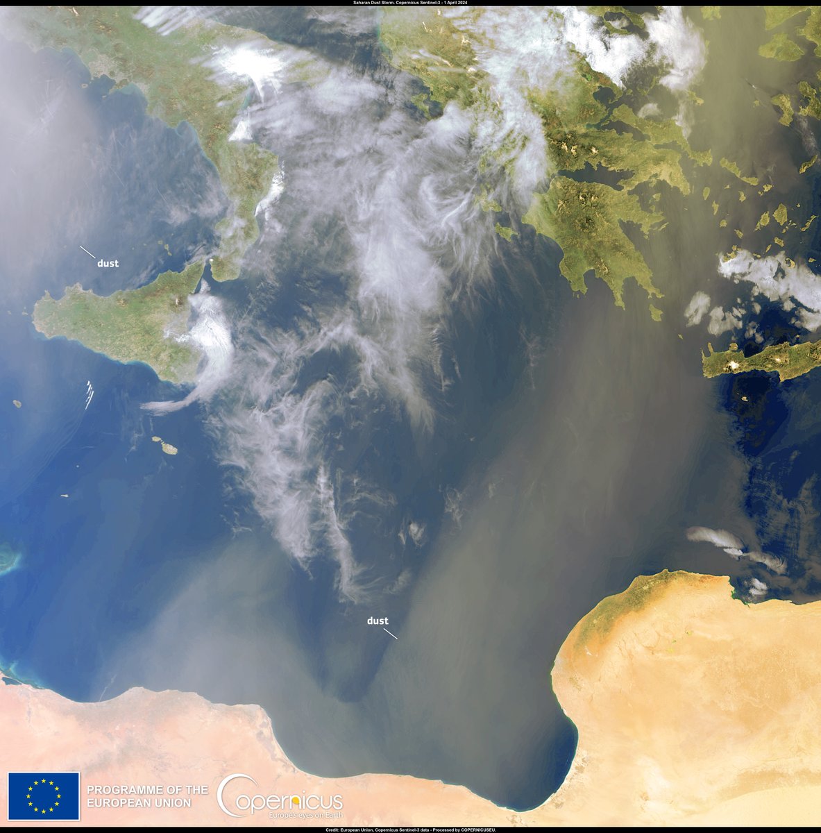 Τις τελευταίες ημέρες, η σκόνη από την έρημο Σαχάρα καλύπτει τον ουρανό πάνω από την Ευρώπη, από την Βόρεια Αφρική μέχρι την Εσθονία. Η εικόνα που ακολουθεί λήφθηκε την 1η Απριλίου από τον δορυφόρο Sentinel3 και δείχνει νέφη σκόνης να διασχίζουν τη Μεσόγειο προς την Ελλάδα: