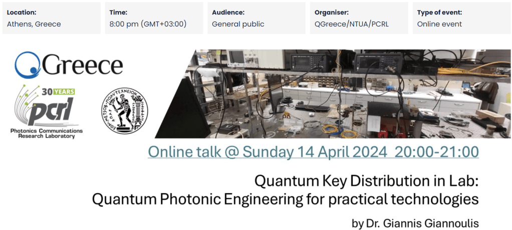 Εκεί βρίσκουμε ότι στην Ελλάδα έχει προγραμματιστεί για τις 14 Απριλίου 2024, 20:00-21:00, ομιλία του Dr. Γιάννη Γιαννούλη μέσω webex, με τίτλο ‘Quantum Key Distribution In Lab: Quantum Photonic Engineering For Practical Technologies‘
