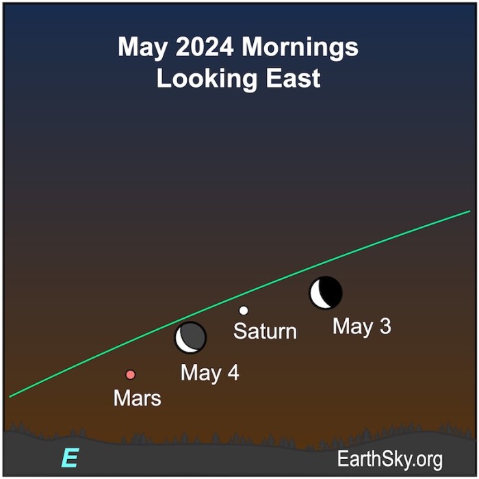 | 4 | Η Σελήνη σε απόσταση 2,5ο από τον Κρόνο (πρωινός ουρανός, ανατολή Σελήνης 25 ημερών 04:23 π.μ.) Μέγιστο βροχής διαττόντων «η-Υδροχοΐδες» (ενεργές 19/4-28/5, μέγιστος ρυθμός υπό ιδανικές συνθήκες 40 μετέωρα/ώρα) |