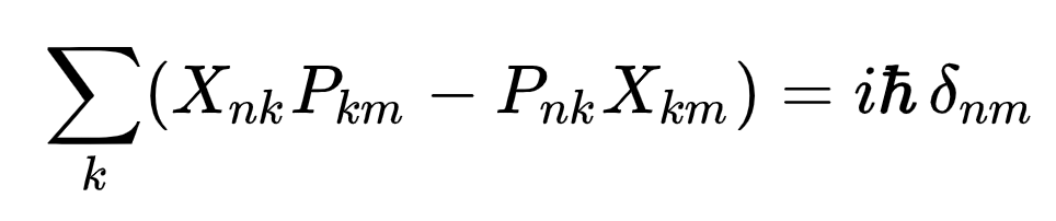 Η εξίσωση αυτή είναι η αρχή της αβεβαιότητας του Heisenberg και μας λέει ότι ο πολλαπλασιασμός της θέσης επί την ταχύτητα είναι διαφορετικός από τον πολλαπλασιασμό της ταχύτητας επί την θέση. Αν η θέση και η ταχύτητα ήταν αριθμοί δεν θα υπήρχε διαφορά, γιατί π.χ. το 7×8 είναι το ίδιο με το 8×7. Όμως εδώ η θέση και η ταχύτητα είναι πίνακες αριθμών και όταν πολλαπλασιάζουμε δύο πίνακες Α και Β παίζει ρόλο η σειρά πολλαπλασιασμού αφού Α×Β≠Β×Α. Η εξίσωση της αβεβαιότητας μας δίνει τη διαφορά μεταξύ του αποτελέσματος πολλαπλασιασμού δύο ποσοτήτων μείον το αποτέλεσμα του πολλαπλασιασμού αν τις αντιμεταθέσουμε. Είναι όμορφα συμπαγής, πολύ απλή και … ακατανόητη. Μην προσπαθήσετε να την αποκρυπτογραφήσετε: οι επιστήμονες και οι φιλόσοφοι εξακολουθούν να ‘παλεύουν’ μεταξύ τους για το νόημά της.