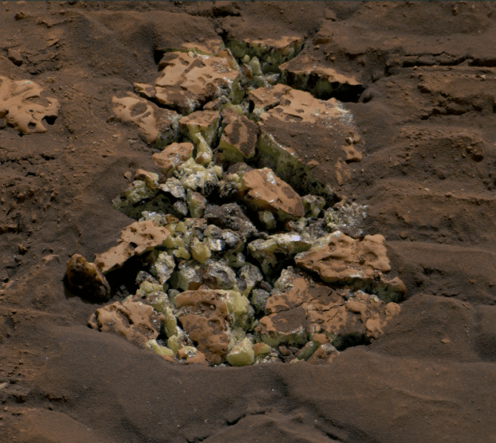 Στις 30 Μαΐου το διαστημικό όχημα Curiosity (Περιέργεια) που εξερευνά εδώ και 14 χρόνια την επιφάνεια του Άρη, πέρασε πάνω από μια πέτρα θρυμματίζοντάς την. Οι επιστήμονες της NASA εξετάζοντας τα θραύσματα έμειναν έκπληκτοι όταν διαπίστωσαν κάτι που δεν είχαν ξαναδεί στον Κόκκινο Πλανήτη: κίτρινους κρυστάλλους θείου.