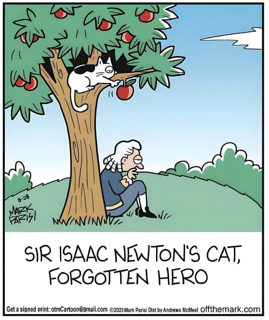 Αν και η πιο διάσημη γάτα στη Φυσική είναι η γάτα του Σρέντιγκερ, διάφορες ιστορίες που κυκλοφορούν (βλέπε π.χ ΕΔΩ: www.mathpages.com) αναφέρονται και στη γάτα του Νεύτωνα! Φαίνεται όμως ότι οι περισσότερες από αυτές μάλλον δεν έχουν σχέση με την πραγματικότητα. Η πιο αληθοφανής ιστορία σχετικά με την γάτα του Νεύτωνα περιγράφεται στο παρακάτω σκίτσο και αναφέρεται στην πτώση του μήλου στο κεφάλι του και την επακόλουθη έμπνευση της ιδέας της βαρύτητας: