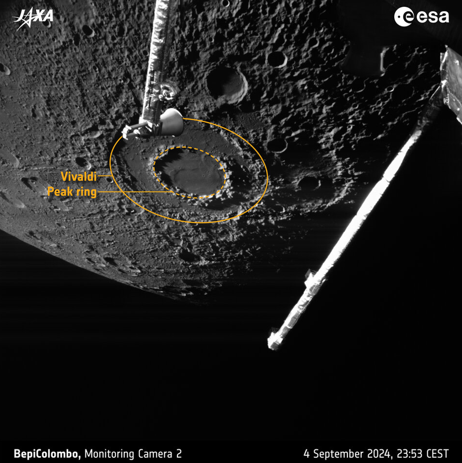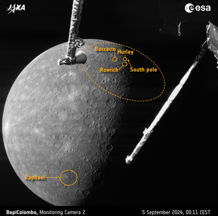 Στην φωτογραφία σημειώνονται οι περιοχές που θα ήθελαν οι επιστήμονες να μελετήσουν με πολύ περισσότερες λεπτομέρειες όταν το BepiColombo θα ξεκινήσει την κύρια επιστημονική αποστολή του, στις αρχές του 2027. Για πρώτη φορά, το BepiColombo «βλέπει» τον νότιο πόλο του Ερμή (πάνω δεξιά). Το φως του ήλιου δεν φτάνει ποτέ στον πυθμένα ορισμένων κρατήρων σε αυτήν την περιοχή, επομένως, παρά το γεγονός ότι ο πλανήτης είναι πολύ κοντά στον Ήλιο, είναι πιθανό να διατηρείται εκεί παγωμένο νερό. Στην φωτογραφία φαίνονται επίσης, η κεραία υψηλής απολαβής στο κέντρο και πάνω δεξιά το μαγνητόμετρο του διαστημικού σκάφους.