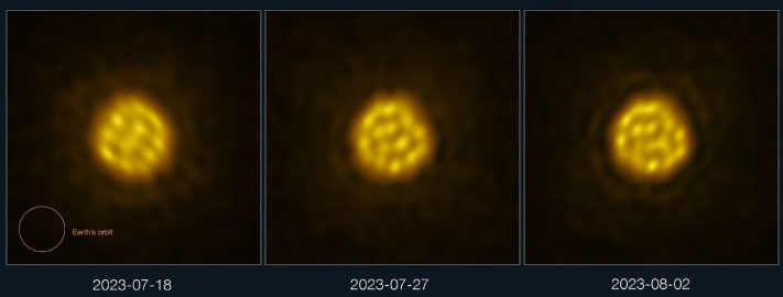 Οι νέες εικόνες της συστοιχίας ραδιοτηλεσκοπίων ALMA στη Χιλή δείχνουν γιγάντιες φυσαλίδες πλάσματος (ιονισμένου αερίου) να κοχλάζουν στην επιφάνεια του άστρου «R της Δοράδος», έναν ερυθρό γίγαντα περίπου 300 φορές μεγαλύτερο από τον Ηλιο που βρίσκεται στον ομώνυμο αστερισμό, 180 έτη φωτός από τη Γη.