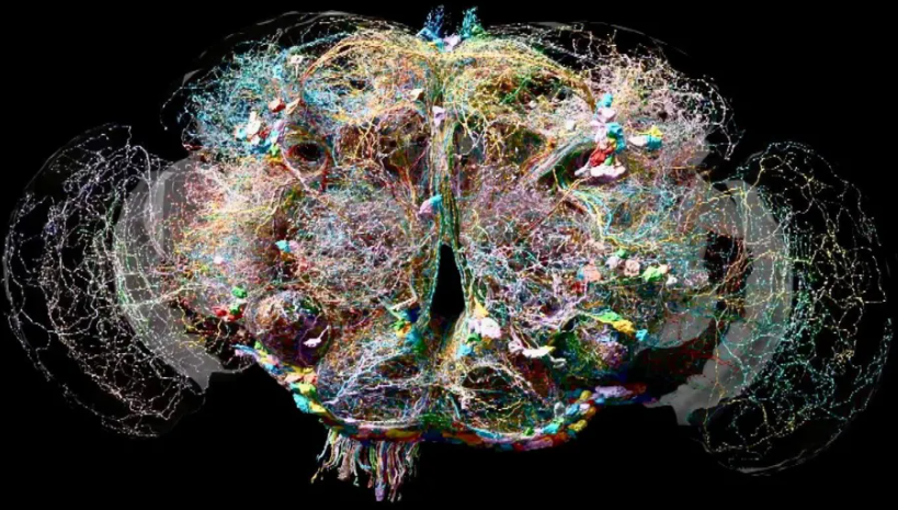 Ένας ολόκληρος εγκέφαλος μύγας έχει πλάτος μικρότερο από ένα χιλιοστό. Οι ερευνητές χρησιμοποίησαν εικόνες του εγκεφάλου μιας θηλυκής φρουτόμυγας από ηλεκτρονικό μικροσκόπιο και ανακατασκεύασαν όλους τους νευρώνες με τη βοήθεια εργαλείου τεχνητής νοημοσύνης που αναπτύχθηκε στο Πανεπιστήμιο Πρίνστον. Ωστόσο, καθώς η τεχνητή νοημοσύνη κάνει πολλά λάθη σε σύνολα δεδομένων αυτού του μεγέθους, η κοινοπραξία FlyWire που αποτελείται από 287 ερευνητές σε ομάδες από περισσότερα από 76 εργαστήρια σε όλο τον κόσμο και εθελοντές, δαπάνησε περίπου 33 ανθρωποέτη για την επίπονη διόρθωση όλων των δεδομένων.