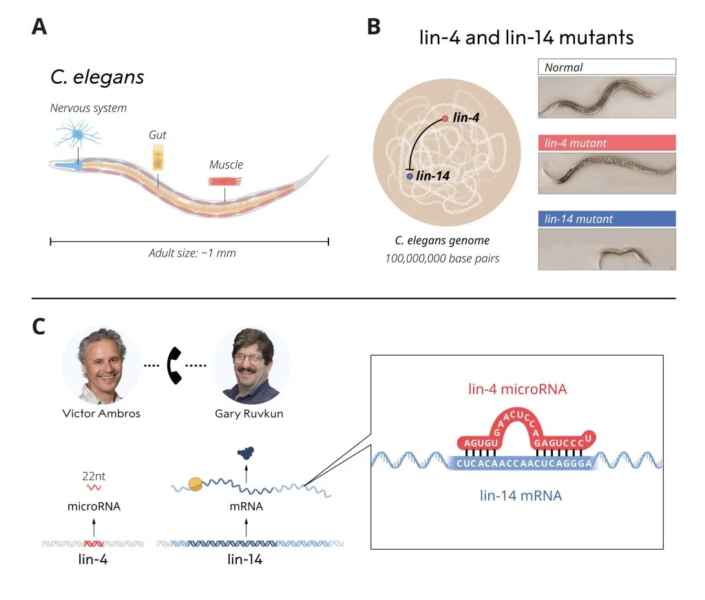 Στα τέλη της δεκαετίας του 1980, οι Victor Ambros και Gary Ruvkun ήταν μεταδιδακτορικοί υπότροφοι στο εργαστήριο του Robert Horvitz, ο οποίος τιμήθηκε με βραβείο Νόμπελ το 2002, μαζί με τους Sydney Brenner και John Sulston. Στο εργαστήριο του Horvitz, μελέτησαν ένα «ταπεινό» σκουλήκι μήκους 1 mm, το C. elegans (Καινοραβδίτης ο κομψός). Παρά το μικρό του μέγεθος, το C. elegans περιέχει πολλούς εξειδικευμένους τύπους κυττάρων, όπως νευρικά και μυϊκά κύτταρα που βρίσκονται επίσης σε μεγαλύτερα, πιο πολύπλοκα ζώα, καθιστώντας το ένα χρήσιμο μοντέλο για τη διερεύνηση του τρόπου με τον οποίο αναπτύσσονται και ωριμάζουν οι ιστοί σε πολυκύτταρους οργανισμούς. Οι Ambros και Ruvkun ενδιαφέρθηκαν για γονίδια που ελέγχουν το χρόνο ενεργοποίησης διαφορετικών γενετικών προγραμμάτων, διασφαλίζοντας ότι διάφοροι τύποι κυττάρων αναπτύσσονται την κατάλληλη στιγμή. Μελέτησαν δύο μεταλλαγμένα στελέχη σκουληκιών, τα lin-4 και lin-14, που εμφάνιζαν ελαττώματα στον χρόνο ενεργοποίησης των γενετικών προγραμμάτων κατά την ανάπτυξη. Οι βραβευθέντες ήθελαν να αναγνωρίσουν τα μεταλλαγμένα γονίδια και να κατανοήσουν τη λειτουργία τους. Ο Ambros είχε προηγουμένως δείξει ότι το γονίδιο lin-4 φαινόταν να είναι ένας αρνητικός ρυθμιστής του γονιδίου lin-14. Ωστόσο, ο τρόπος με τον οποίο αποκλειόταν η δραστηριότητα του lin-14 ήταν άγνωστος. Οι Ambros και Ruvkun ενδιαφέρθηκαν γι αυτά τα μεταλλαγμένα στελέχη και την πιθανή σχέση τους και ξεκίνησαν να λύσουν αυτά το μυστήριο.