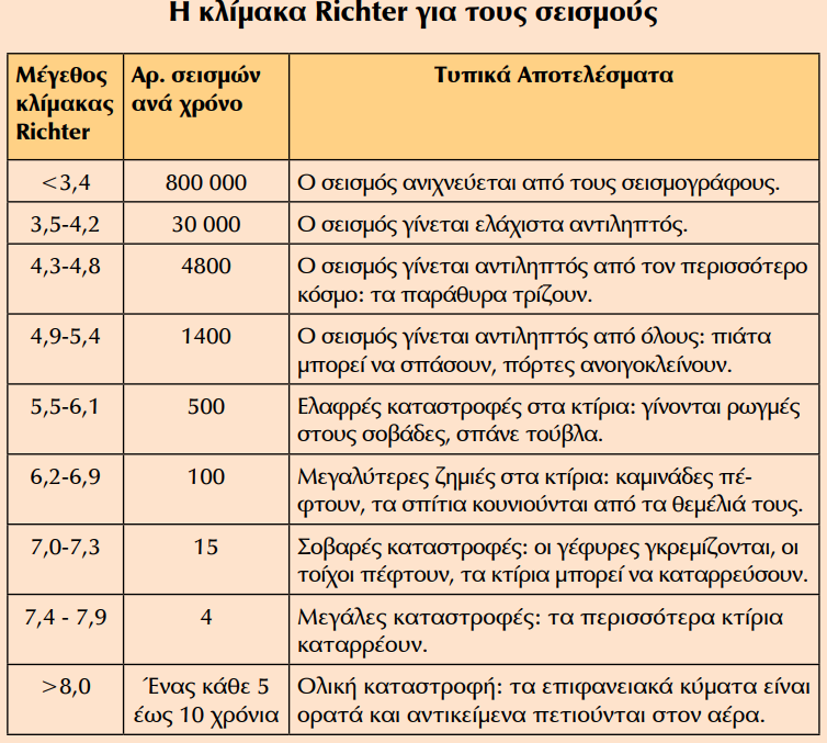 Το κάθε νούμερο σ’ αυτή την κλίμακα αντιπροσωπεύει το ποσόν της ενέργειας που απελευθερώνεται και μεταφέρεται από τα σεισμικά κύματα. Όταν αυξάνει το μέγεθος του σεισμού κατά 1 βαθμό στην κλίμακα Richter, η ενέργεια που απελευθερώνεται κατά τη διάρκεια του σεισμού είναι 30 φορές μεγαλύτερη. Αυτό σημαίνει ότι, αν συγκρίνουμε δύο σεισμούς με μεγέθη 4 και 7 Richter, θα διαπιστώσουμε ότι στο δεύτερο σεισμό απελευθερώνεται 30x30x30 περίπου 30.000 φορές περισσότερη ενέργεια.