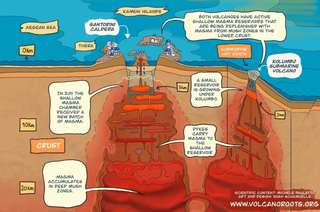 2. στο Forbes το άρθρο με τίτλο: ‘Santorini Earthquakes Create Panic In Greece As Locals Fear Volcano Could Erupt‘, στο οποίο δημοσιεύεται και η παρακάτω καλλιτεχνική απεικόνιση του μάγματος κάτω από Καλντέρα και Κολούμπο: