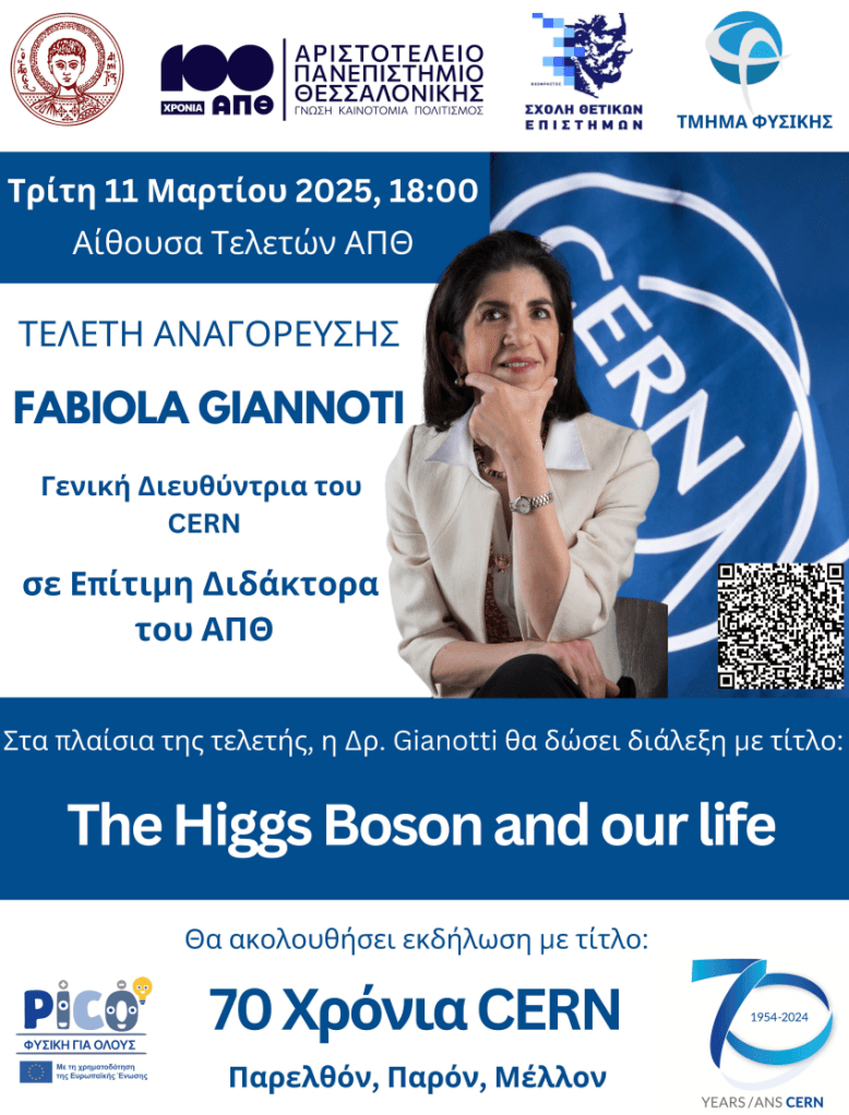 Την Τρίτη 11 Μαρτίου 2025 και ώρα 18:00 στην Αίθουσα Τελετών του Αριστοτελείου Πανεπιστημίου Θεσσαλονίκης, η Dr. Fabiola Gianotti, Γενική Διευθύντρια του Ευρωπαϊκού Οργανισμού Πυρηνικών Ερευνών (CERN), θα αναγορευθεί επίτιμη διδάκτωρ του Τμήματος Φυσικής του Αριστοτελείου Πανεπιστημίου Θεσσαλονίκης. Μετά την αναγόρευσή της η Fabiola Gianotti θα μιλήσει με θέμα: «Το μποζόνιο Higgs και η ζωή μας». Θα ακολουθήσει εκδήλωση για τα 70 χρόνια του Cern.