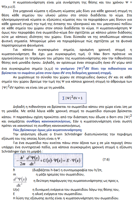 Σύμφωνα με τις αρχικές οδηγίες του υπουργείου παιδείας οι μαθητές έπρεπε (χωρίς κανένα έλεος) να μάθουν να: «Διακρίνουν ότι στην κβαντομηχανική η κατάσταση ενός σωματιδίου περιγράφεται από τη συνάρτηση Schrodinger και όχι από το ζεύγος θέση ταχύτητα της κλασικής μηχανικής. Να διατυπώνουν με λόγια και με τύπους την μονοδιάστατη εξίσωση Schrodinger». Την εξ. (7.6) που βλέπουμε στο παραπάνω απόσπασμα από το βιβλίο.