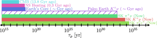 Διασπάται (αυθορμήτως) το πρωτόνιο; Ενώ αυτή ήταν η προκλητική πρόβλεψη των Μεγάλων Ενοποιημένων Θεωριών (GUTs) που αναπτύχθηκε στις δεκαετίες του 1970 και του 1980, οι πειραματικοί φυσικοί την απέκλεισαν – ή μάλλον, έθεσαν ένα κατώτερο όριο στην μέση διάρκεια ζωής του, περίπου στα 1034 χρόνια. Αυτό το χρονικό διάστημα είναι 20 τάξεις μεγέθους μεγαλύτερο από την σημερινή ηλικία του σύμπαντος!