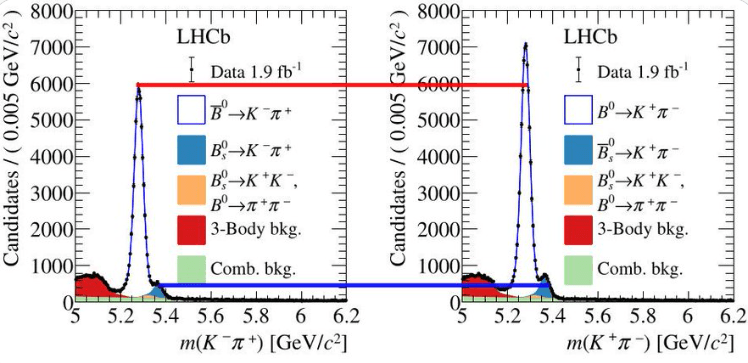(δεξιά), αφού διορθωθεί για πειραματικά αποτελέσματα, είναι μια σαφής εκδήλωση παραβίασης CP. Οι φυσικοί του LHCb υπολόγισαν την αριθμητική τιμή της ασυμμετρίας CP, ACP =(2,45±0,46±0,10)% , που διαφέρει από μηδέν με στατιστική ακρίβεια 5,2 τυπικών αποκλίσεων.
