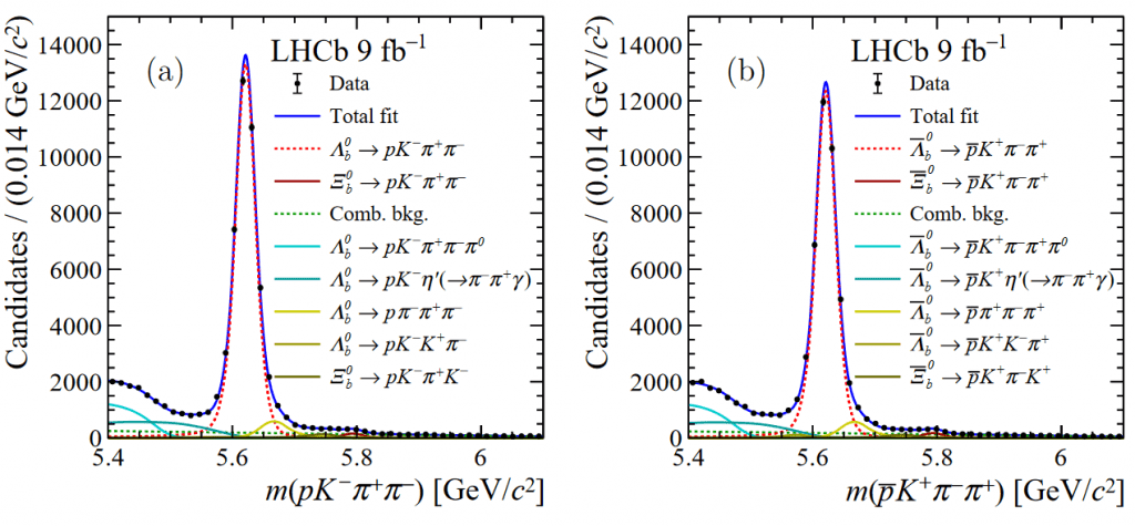 είναι παρόμοια με αυτά του πρωτονίου (uud), με ένα από τα πάνω κουάρκ u να αντικαθίσταται από ένα κουάρκ πυθμένα b. Η παραβίαση CP ποσοτικοποιείται με τη λεγόμενη CP ασυμμετρία, ACP, που ορίζεται ως η σχετική διαφορά μεταξύ των ρυθμών διάσπασης του